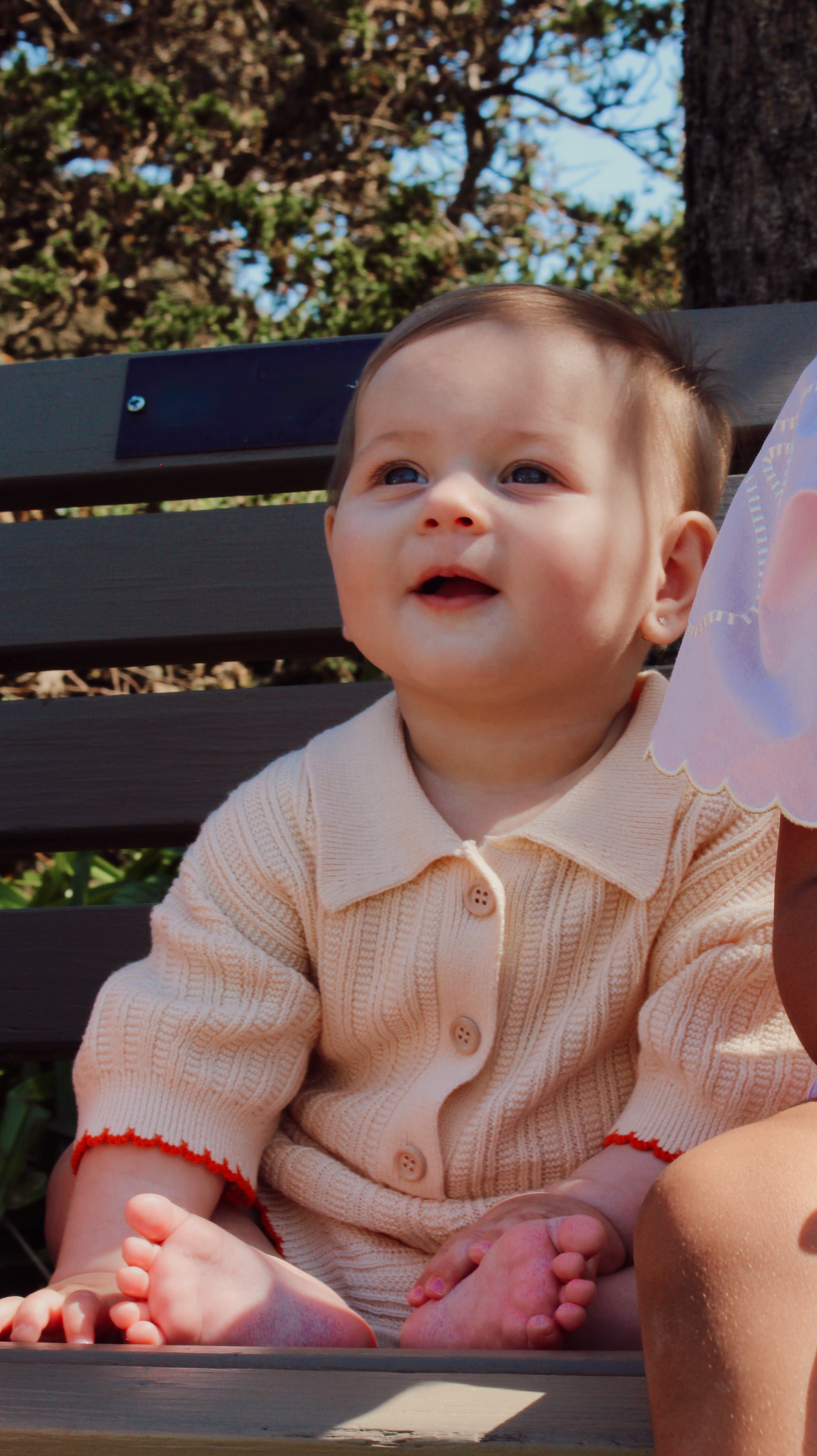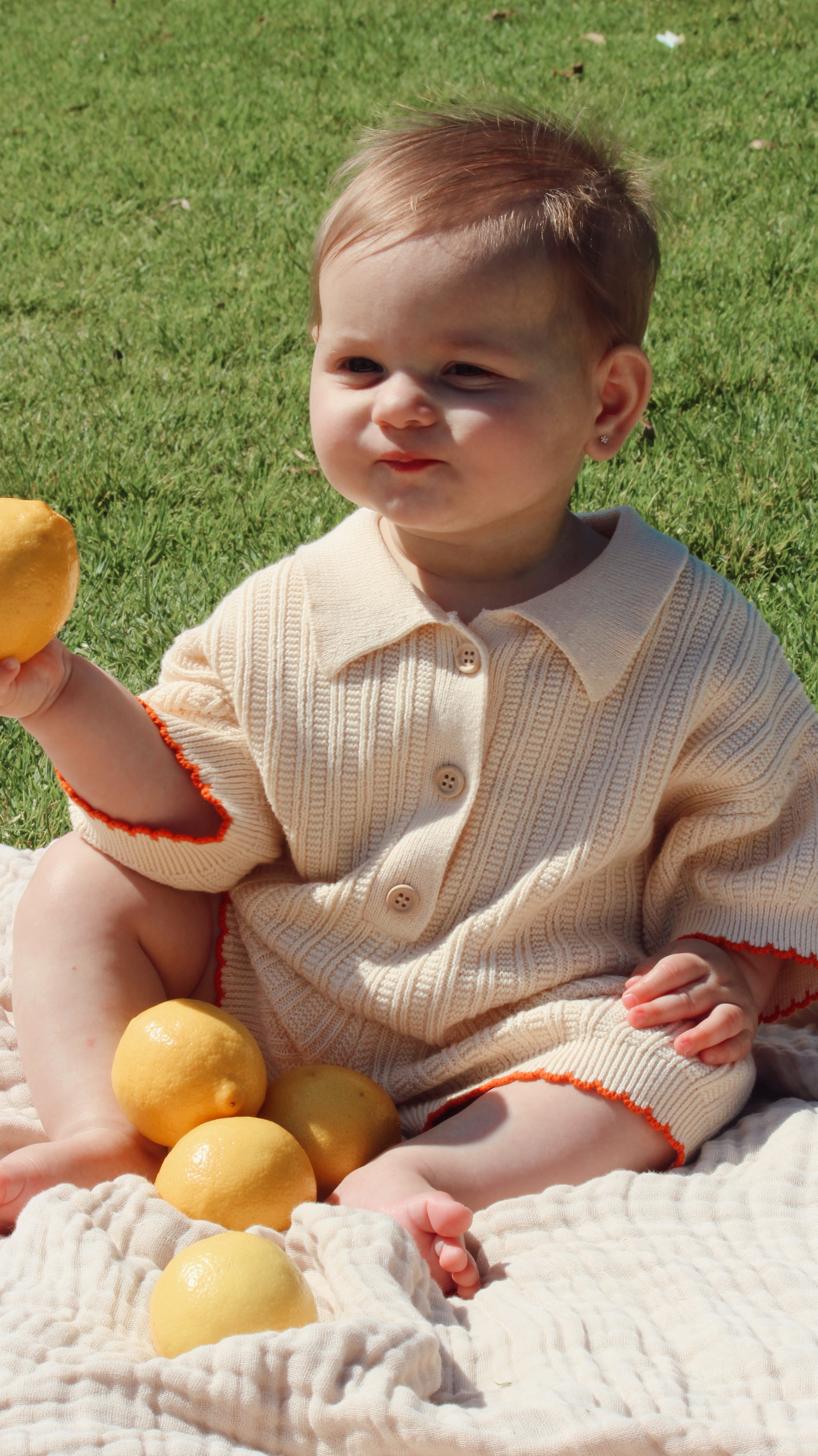 Timeless and effortlessly cute, the Cream Knitted Romper is a staple piece for every little wardrobe. Made from a soft ribbed knit, it features a classic collar, button-down front, and contrast orange scalloped edging for a playful touch. Perfect for everyday wear or special moments, it combines comfort, stretch, and style in one adorable design.