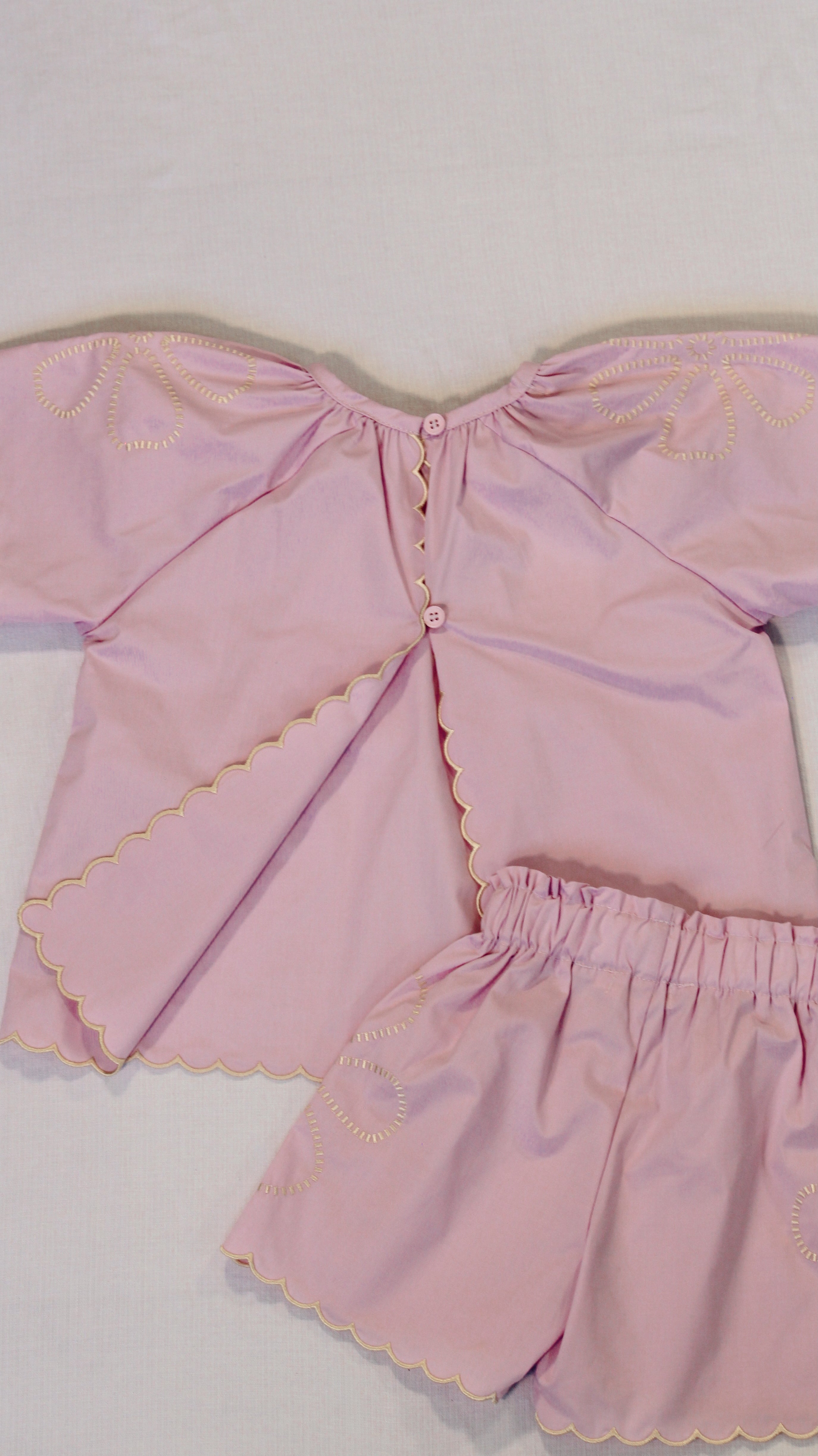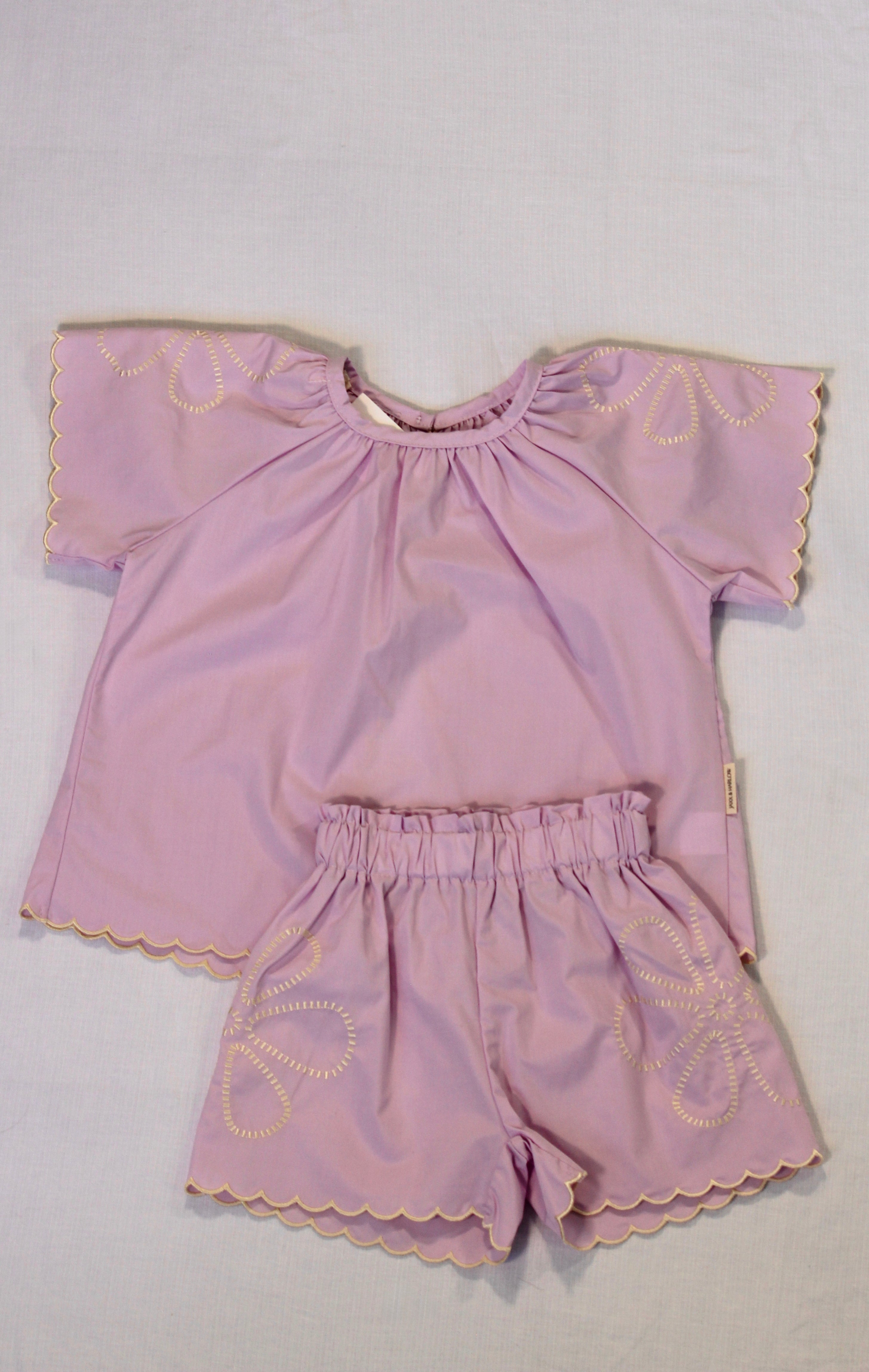Soft, playful, and beautifully detailed, our Lilac Embroidered Set is made for sunshine days and twirling moments. Crafted from 100% bamboo cotton, this two-piece features delicate scalloped edges and dainty yellow embroidery that add a touch of vintage charm. The relaxed-fit top and elasticated shorts make it perfect for effortless everyday wear or special occasions alike.