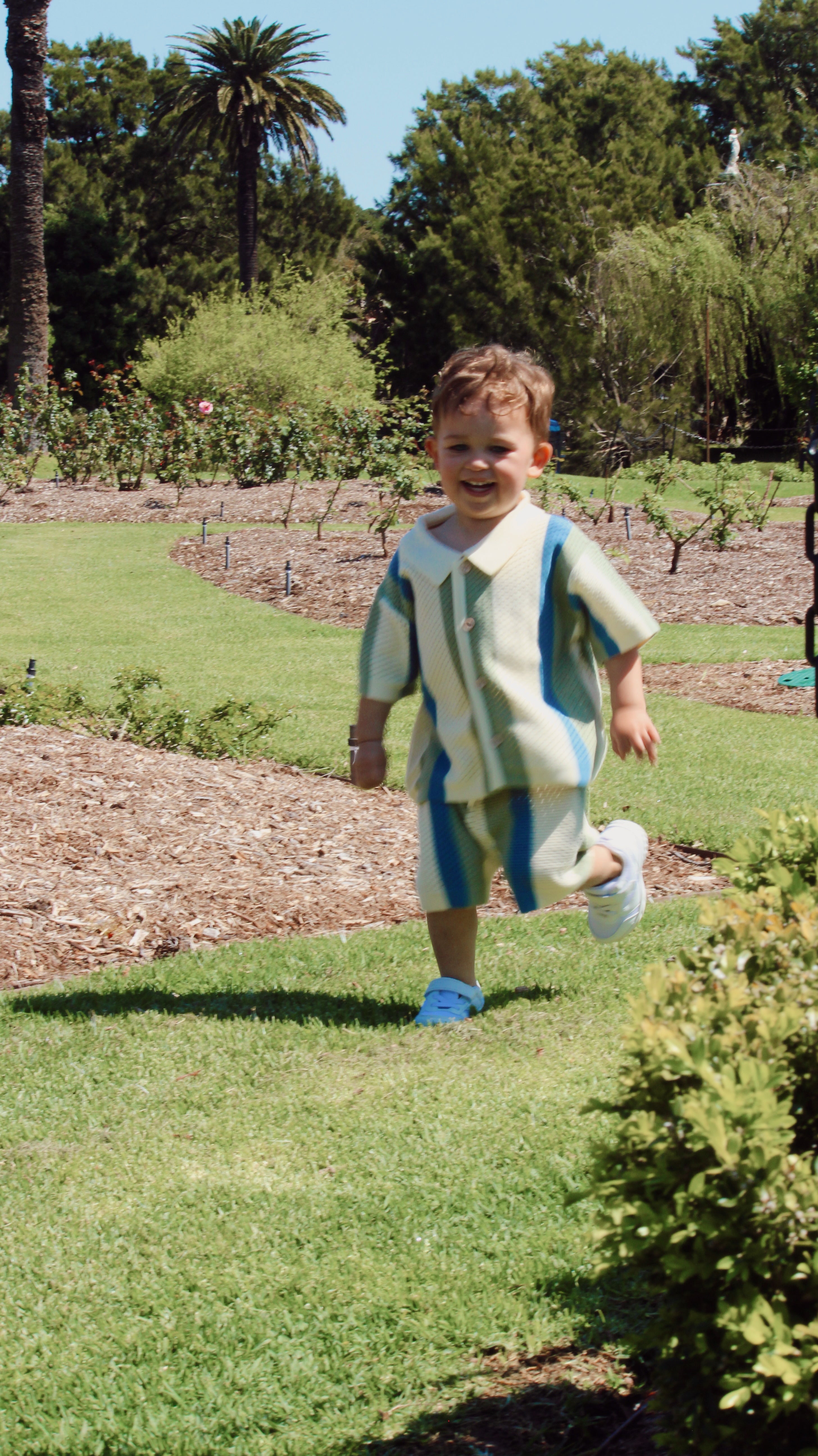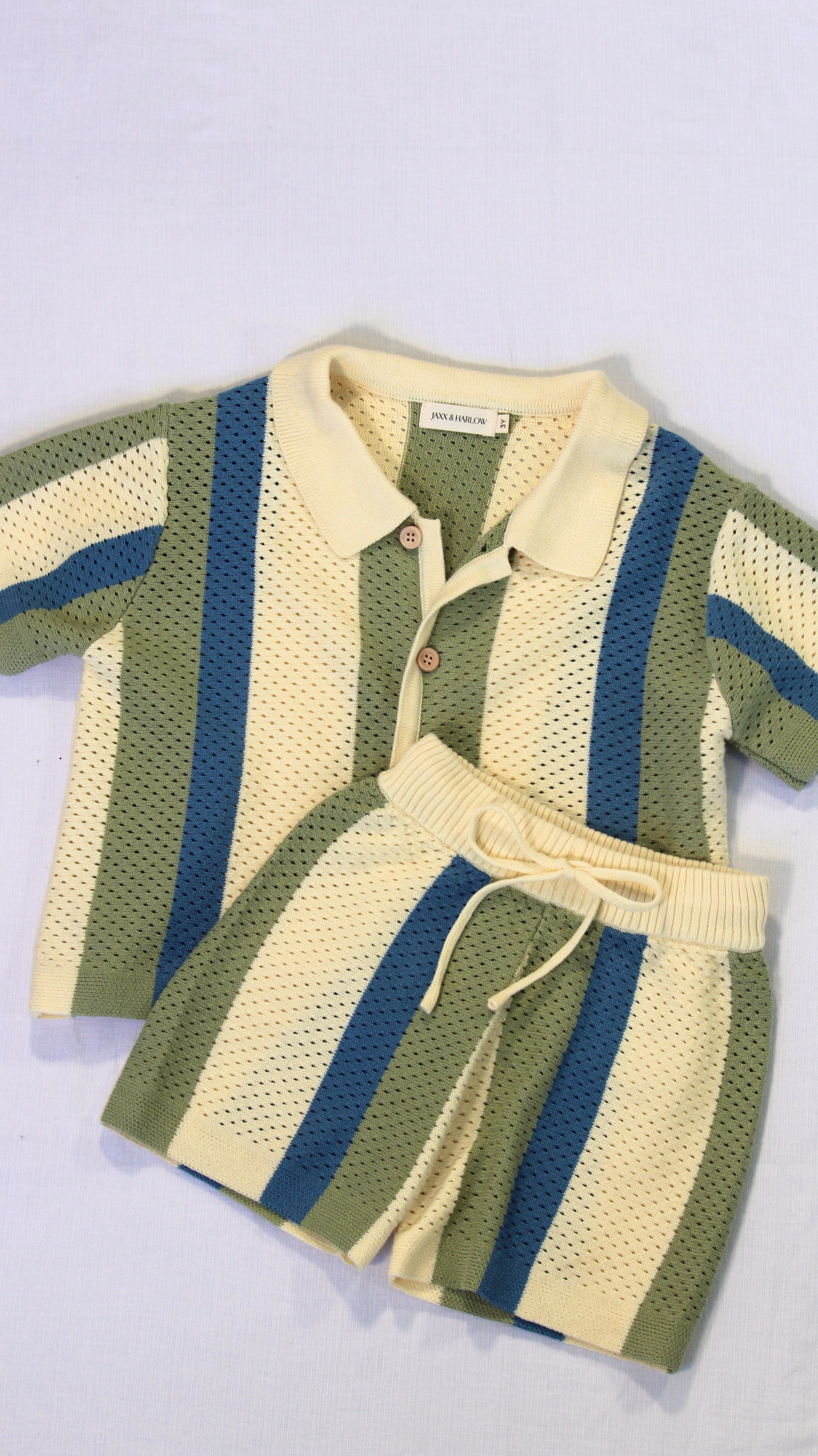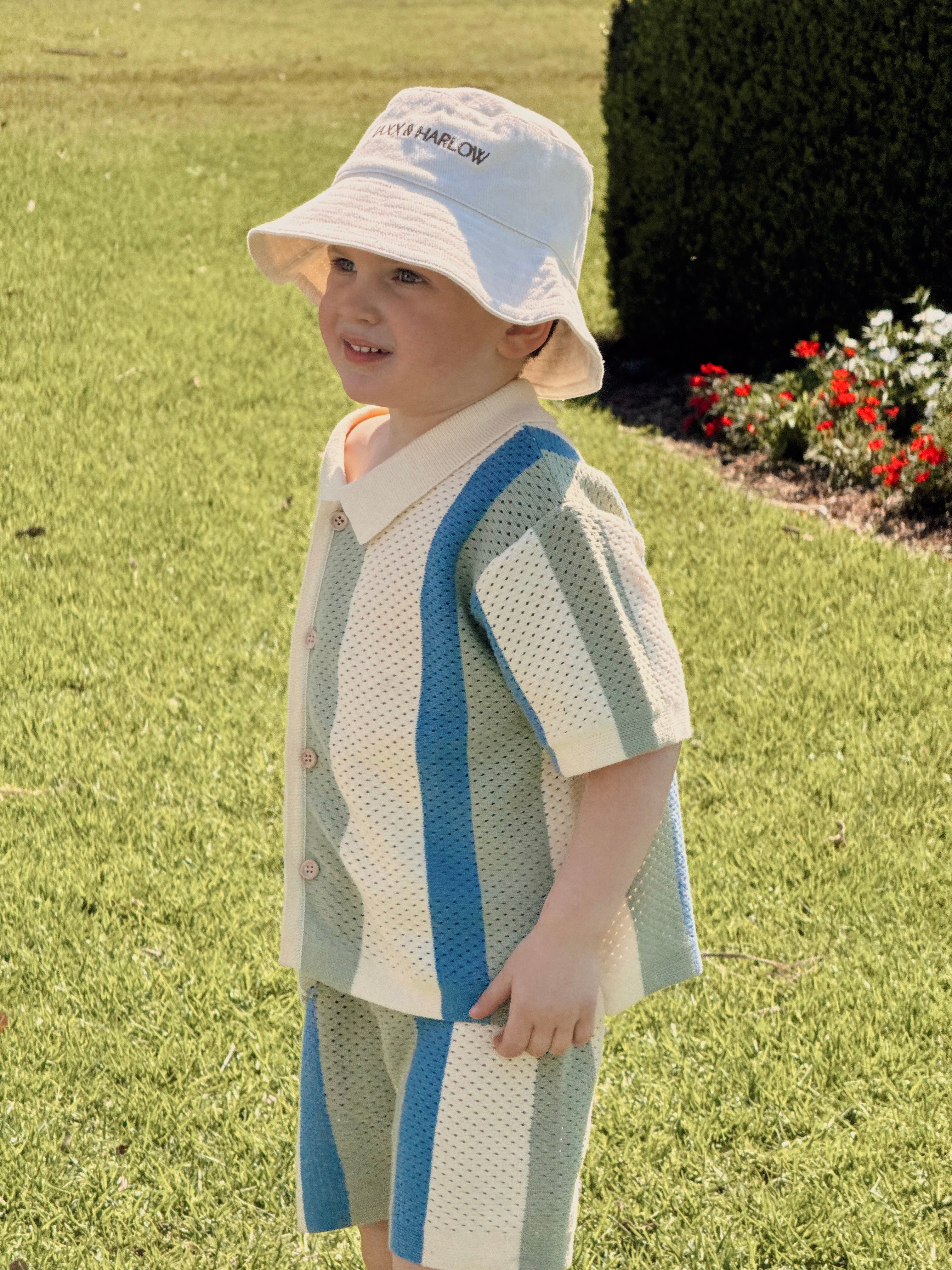 Inspired by nostalgic summer days, The Atlas Set combines comfort and style in a beautiful textured knit. The soft, breathable fabric and earthy stripe palette make this set both playful and refined. With a button-up collared top and elasticated shorts, it’s the perfect outfit for little ones who love to move with ease while looking effortlessly put-together