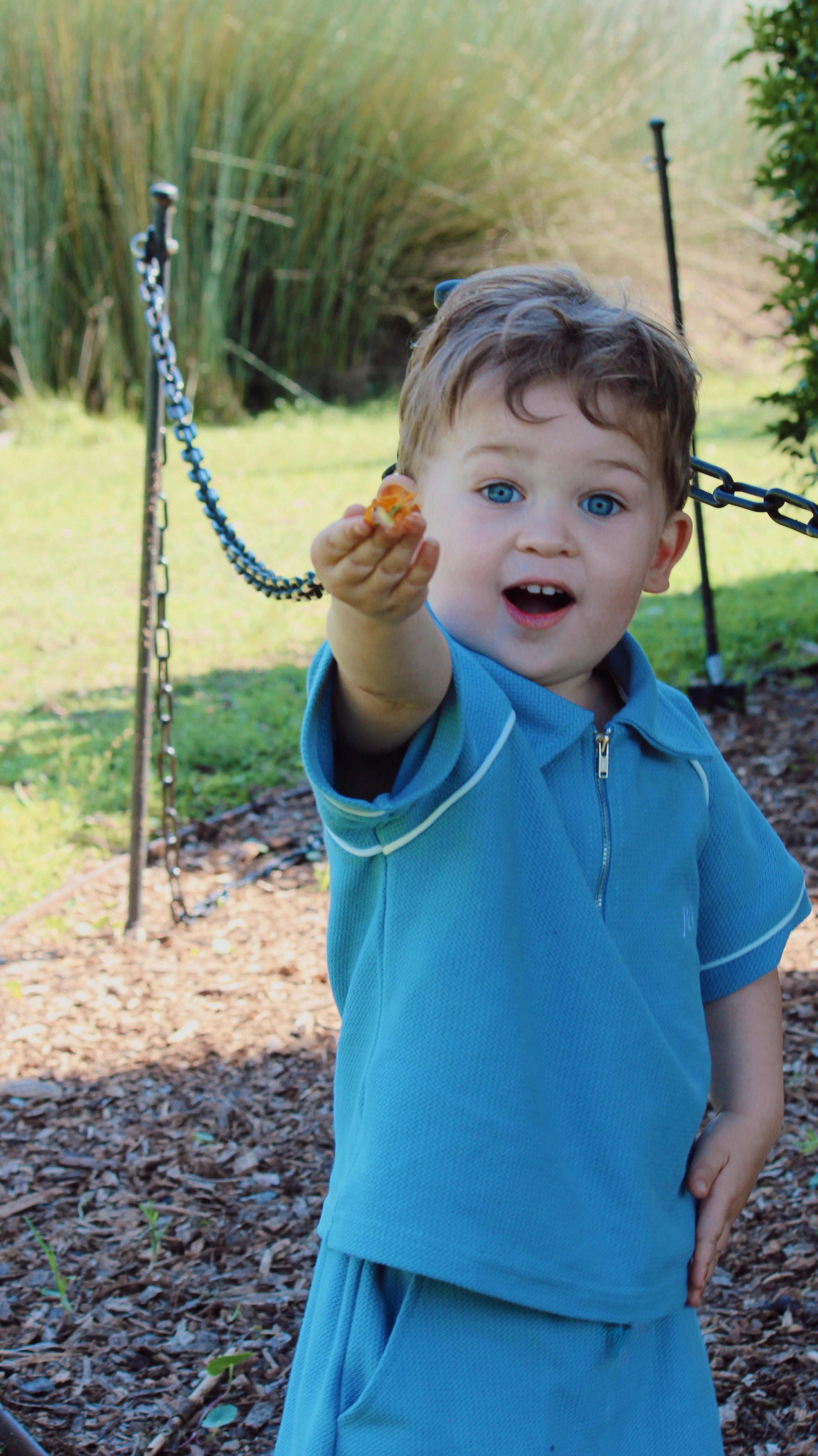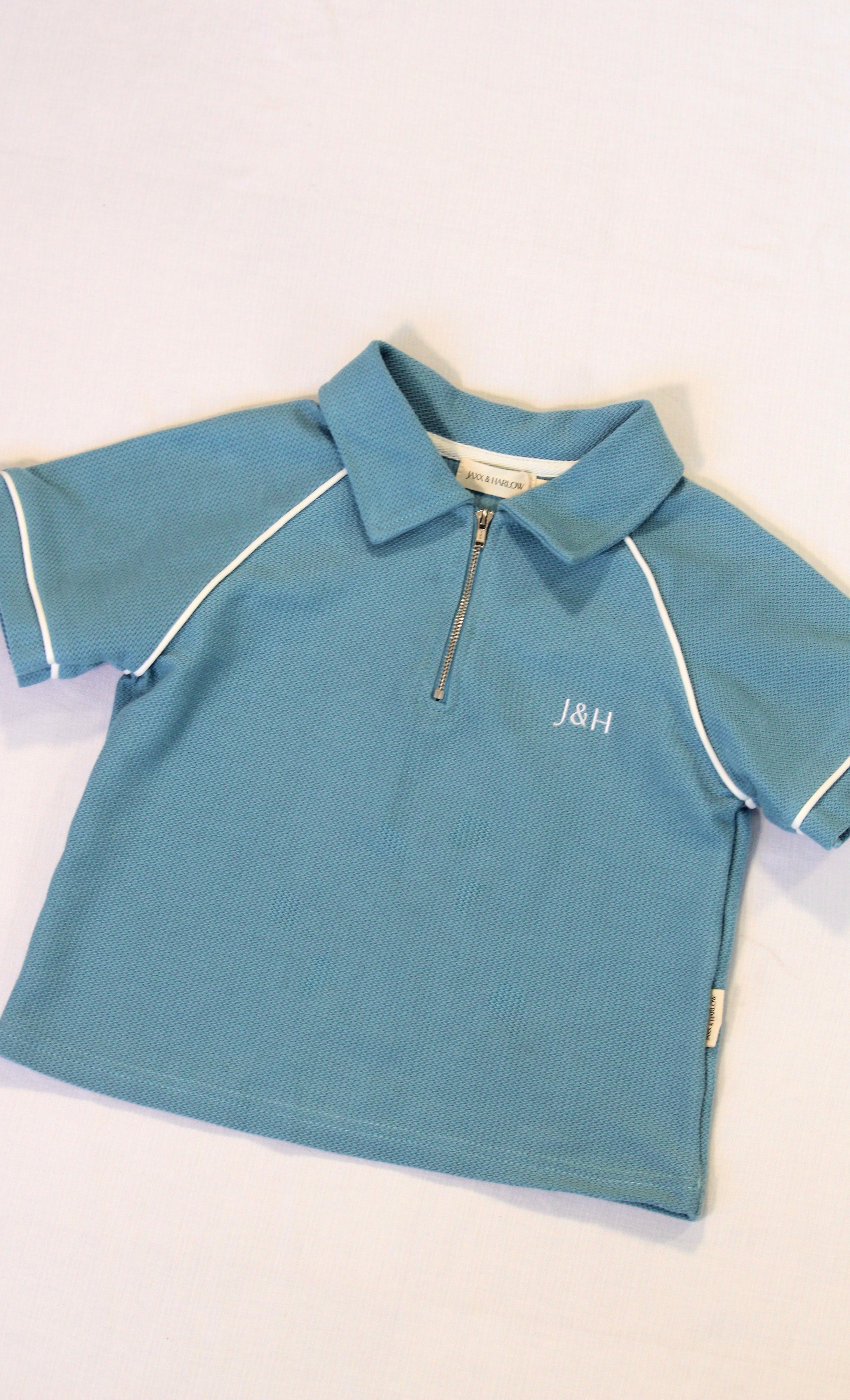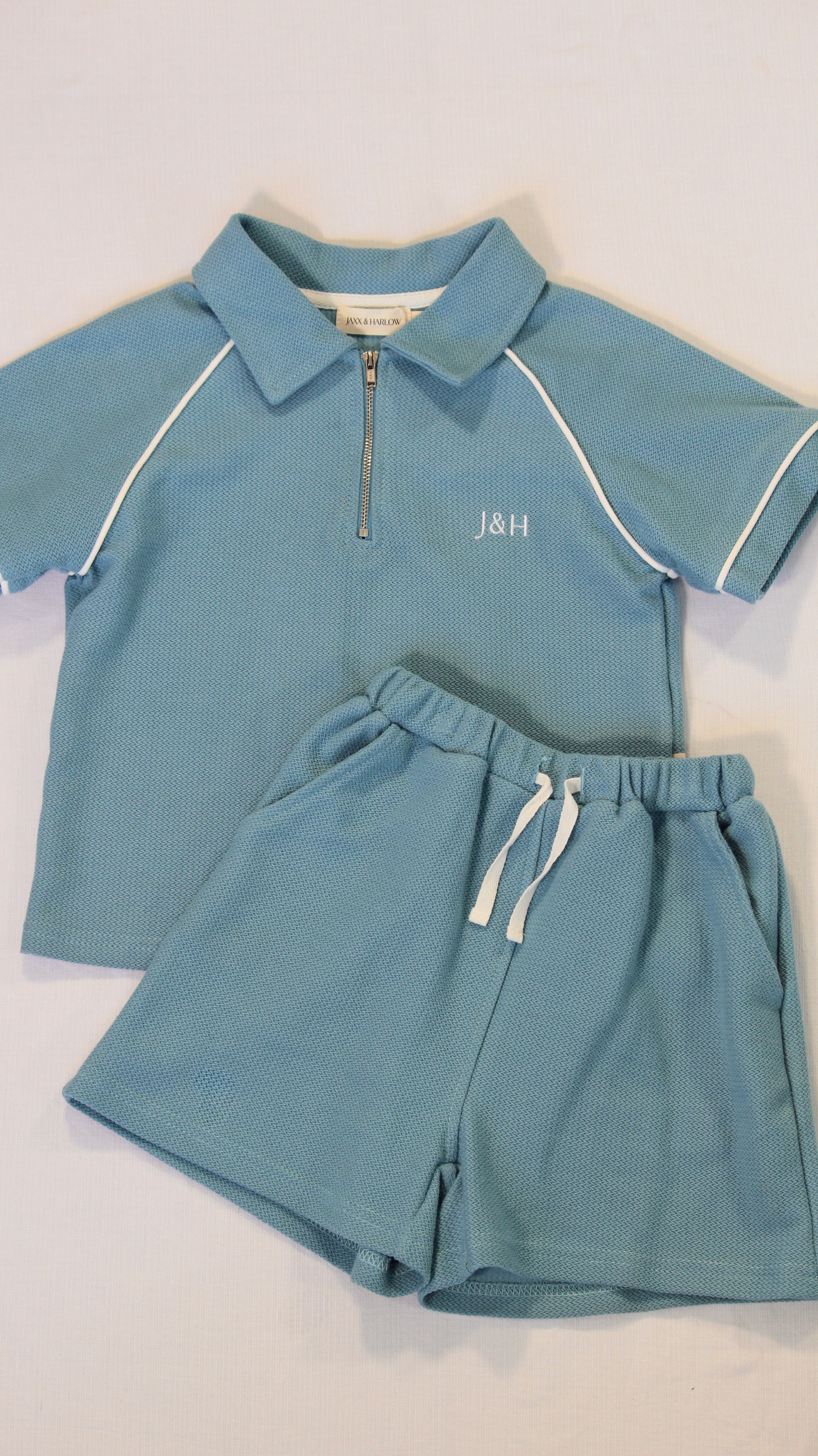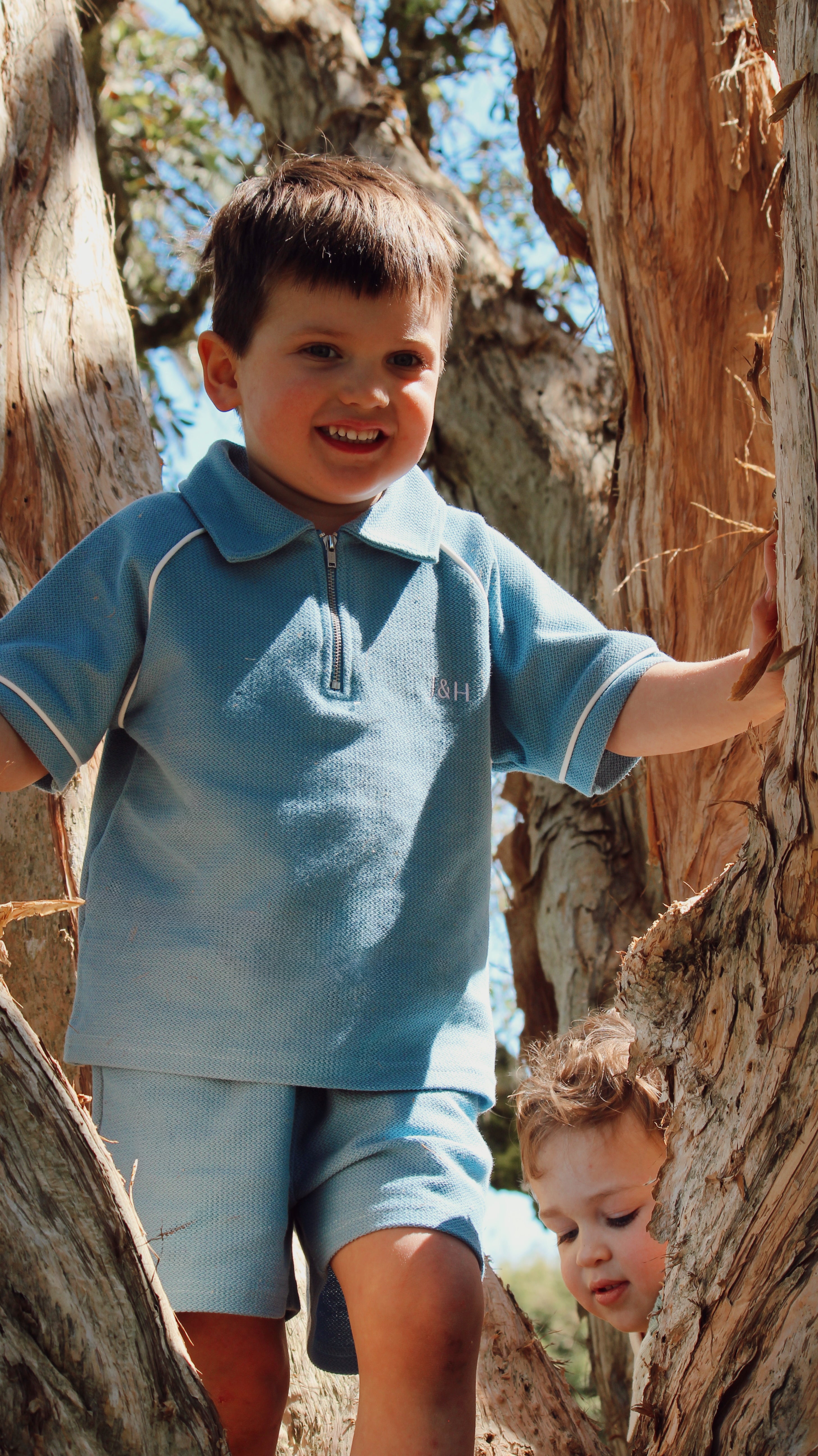 Our Blue Zip Polo Set is the perfect blend of cool and classic. Designed in a breathable textured cotton blend, it features a sporty half-zip detail and crisp white piping for a polished finish. Paired with comfy elastic shorts and a drawstring waist, it’s the ideal go to for playdates, park days, and everything in between.